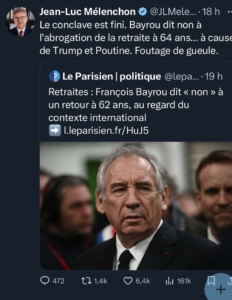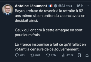 Le refus de revenir à 62 ans a suscité une salve de critiques de la part de La France Insoumise (LFI). Jean-Luc Mélenchon a dénoncé sur X un « foutage de gueule » en réaction aux arguments avancés par Bayrou. Manuel Bompard, député des Bouches-du-Rhône, a qualifié cette décision d' »irresponsable« .