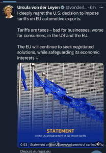 « Les droits de douane sont des taxes, mauvaises pour les affaires, pires pour les consommateurs, tant aux États-Unis que dans l’Union européenne », a affirmé Ursula von der Leyen