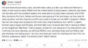 Face à l’escalade militaire entre l’Iran et Israël, Donald Trump est sorti de son silence ce dimanche pour appeler à un accord de paix. Dans un message publié sur son réseau Truth Social, le président américain a exhorté les deux pays à « trouver un accord», se comparant à son rôle passé dans la médiation entre l’Inde et le Pakistan :