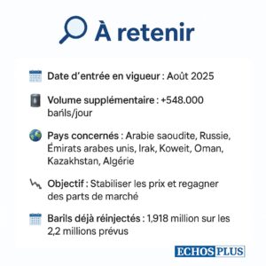 - Huit pays membres, dont l’Arabie saoudite et la Russie, injecteront 548.000 barils supplémentaires par jour dès août 2025, une décision stratégique pour rééquilibrer le marché et contenir les prix.