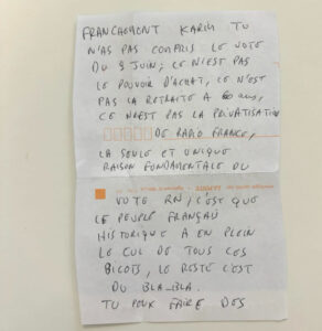 « Le peuple français historique en a plein le cul de tous ces bicots », commence l’auteur anonyme, prétendant expliquer les motivations derrière le soutien au RN. « Franchement Karim, tu n’as pas compris le vote du 9 juin, ce n’est pas le pouvoir d’achat, ce n’est pas la retraite à 60 ans, ce n’est pas la privatisation de Radio France. La seule et unique raison fondamentale du vote RN, c’est que le peuple français historique en a plein le cul de tous ces bicots », poursuit la lettre, avant de s’en prendre directement au journaliste et à ses invités : « Tu peux faire des pieds et des mains avec tes invités islamo-gauchiasses, tu n’y changeras rien, le souchien ne t’acceptera jamais, ni toi, ni tes frérots, et même malgré le nombre vous ne posséderez jamais la France ».
